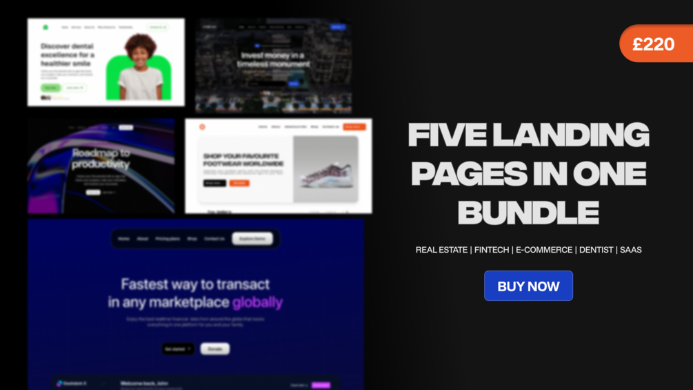 Are you a business owner, marketer, or developer looking to create stunning, high-converting landing pages quickly and effortlessly? Look no further! Our exclusive bundle of 5 landing page templates is tailored to meet the unique needs of different industries, including Real Estate, Fintech, E-Commerce, Dental Practices, and SaaS (Software as a Service).
